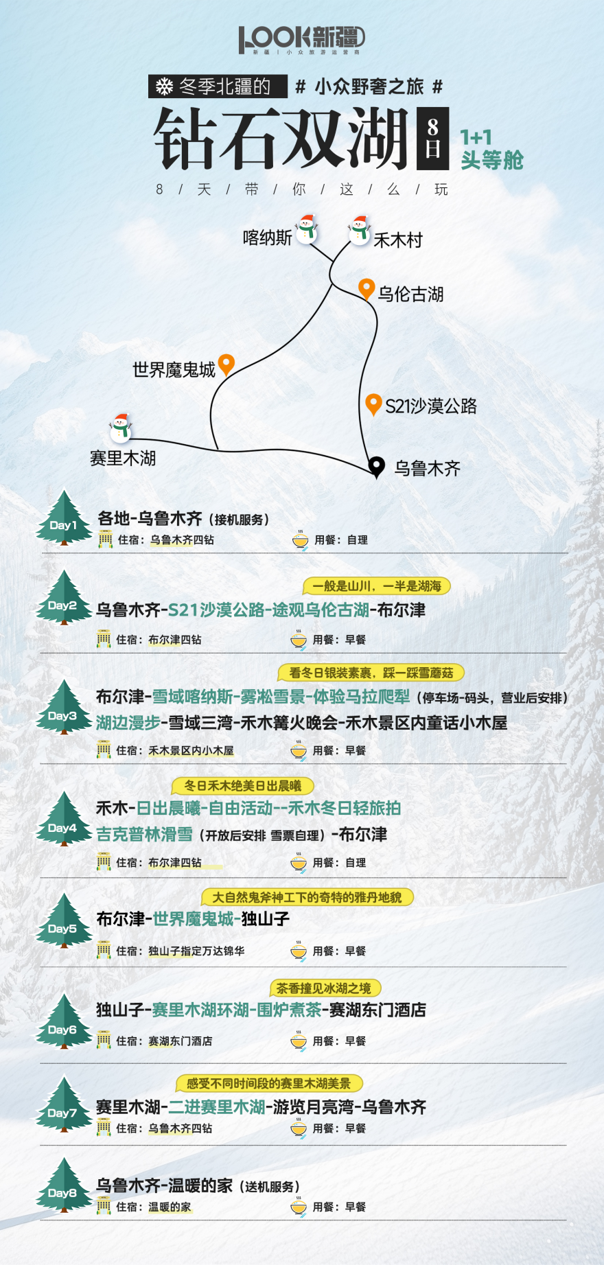 11:00-17:00 游玩【喀纳斯景区】,沿途欣赏阿尔泰山的林海雪原。用手机或架起相机拍摄水墨画中的草原景象。抵达人间仙境——喀纳斯。冬日的喀纳斯洁白纯净,美好治愈,是不能错过的一片净土。一场冰雪之约如期而至。午餐景区内自理。 特别赠送从湖边停车场至码头马拉爬犁体验(季节限定,预计11月20日左右有积雪了开始营业)。(赠送项目,未营业或者不愿坐或不能安排时,恕无费用可退)