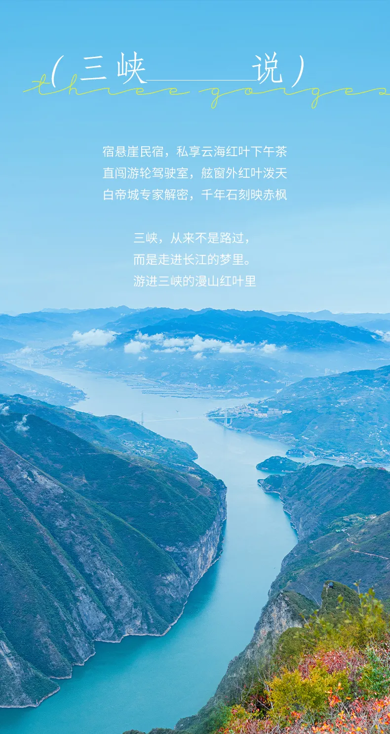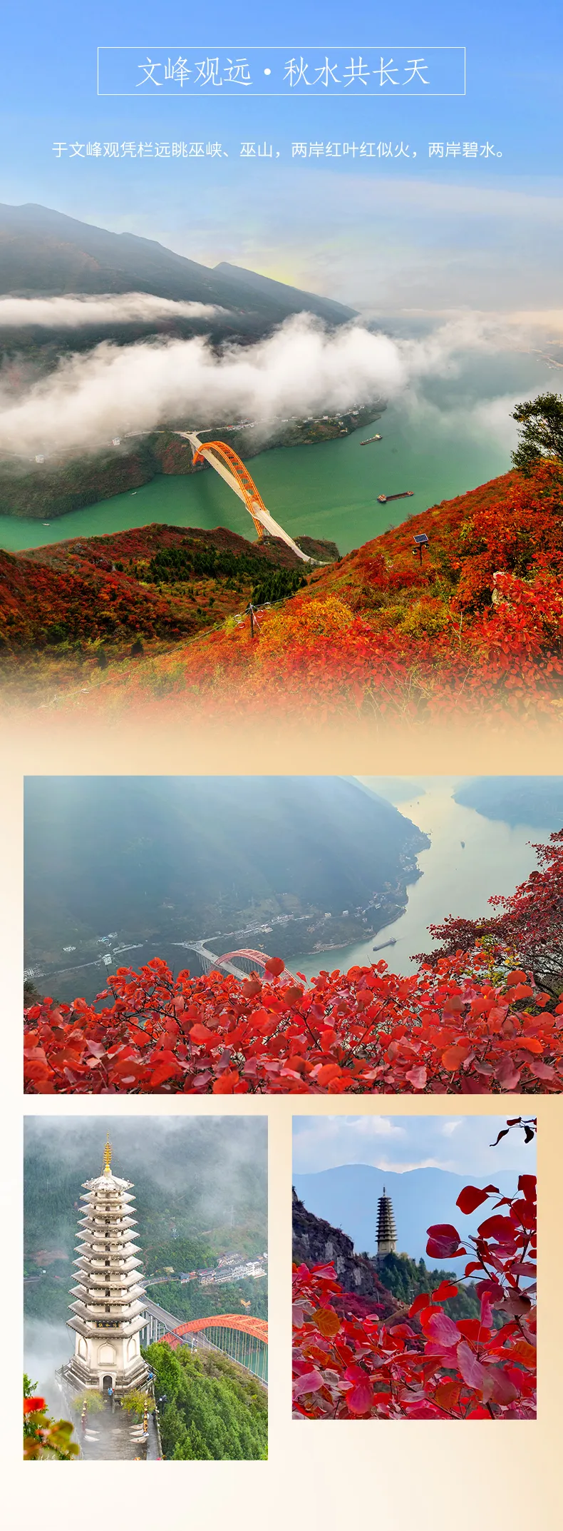 站在文峰观山顶远眺,红叶遍山峦,长江如带、柔润绵长,一江碧水与江山红叶交相辉映,蔚为壮观。透过似火的红叶,俯瞰巫峡口彩虹卧波,“一桥飞架南北,天堑变通途”。远眺巫山县城依山层叠,江与城风情如画,让人顿生江山豪情。