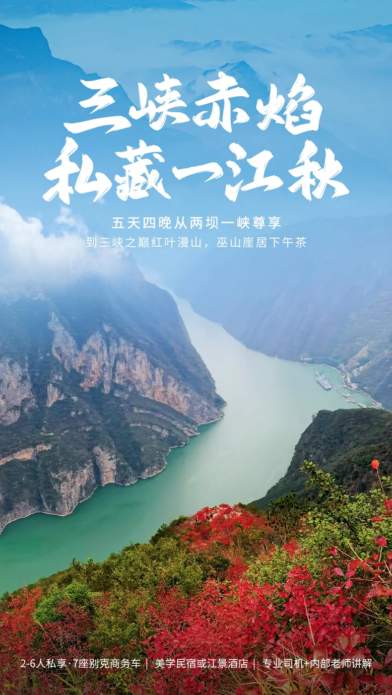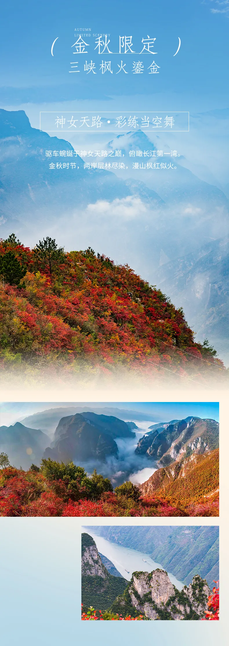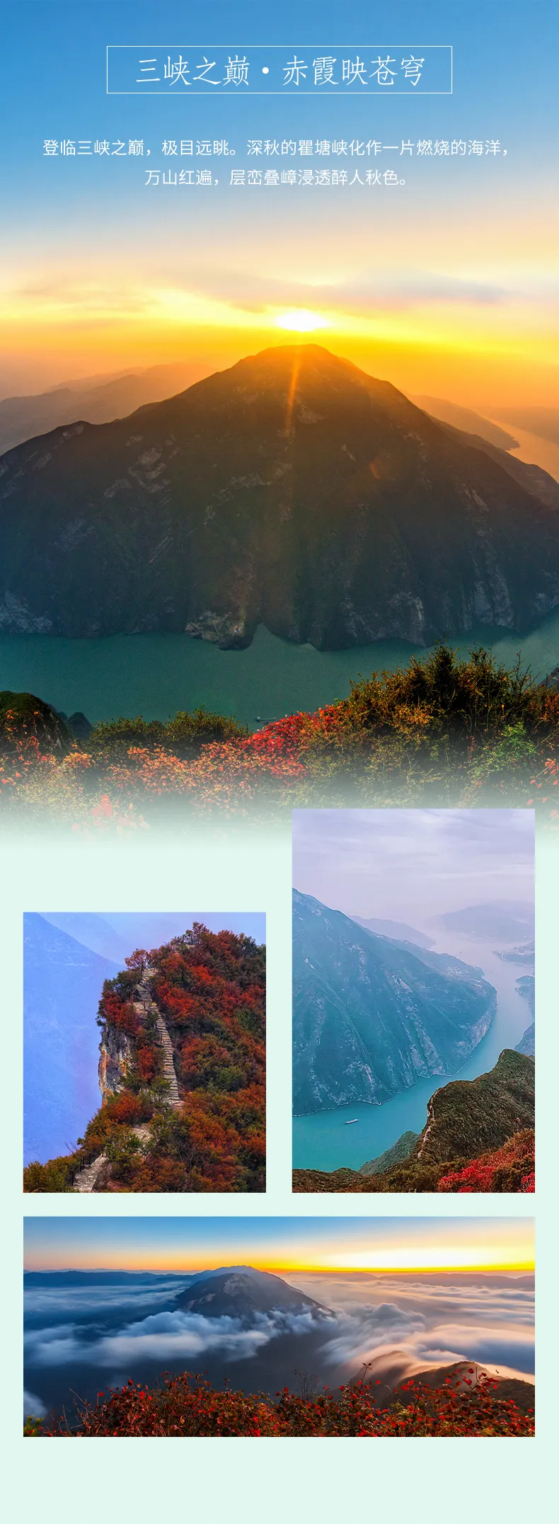 立长江脊梁之巅,1388米云台尽染赤焰!瞿塘峡八百里江山化作熔炉——夔门为炉口,赤甲山为薪柴,秋霜一点,漫山黄栌、枫香、乌桕轰然燃烧!登临处,江流如碧带蜿蜒,游船似金梭穿行,而脚下千峰叠嶂,正以最炽烈的红向苍穹献祭。