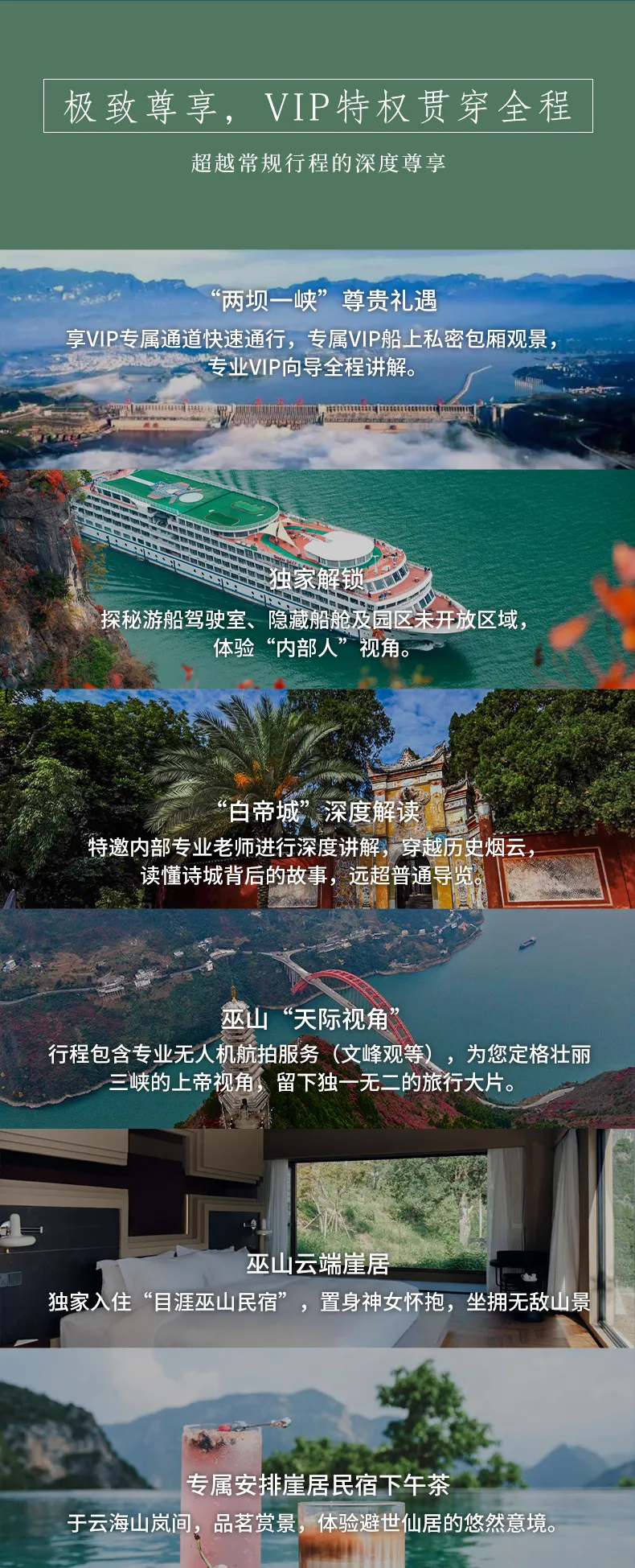 通过【专属VIP休息室与专属通道-免排队】登船,【VIP专属包厢】配备茶水与小食,船行“万里长江第一坝”★葛洲坝,体验过闸的水涨船高,赏“最后的三峡”★西陵峡天然原貌画廊,荆楚风光无限。船上【专属向导】将引路带贵宾观看【不对外开放区域:探秘游轮驾驶舱等】。