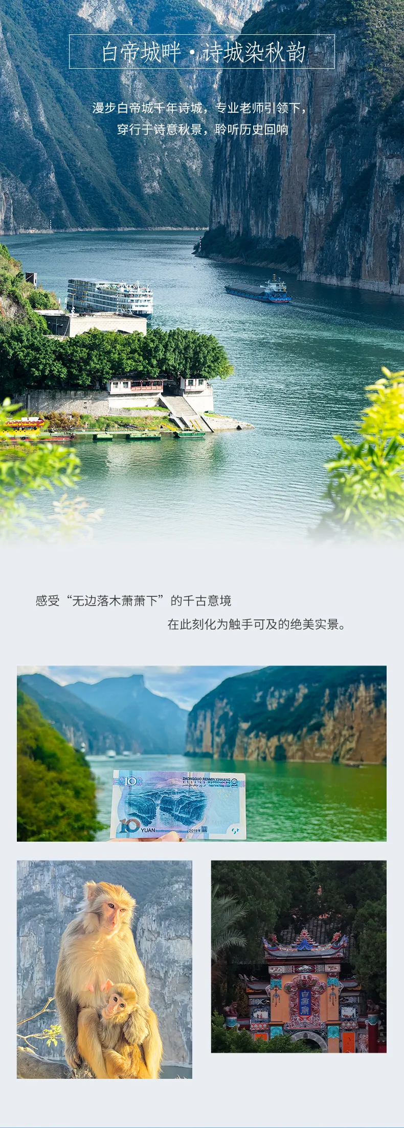 下午,我们将前往白帝城,在专业老师的带领下,感受一下古诗词的文化魅力。并且还可以了解白帝城托孤的典故,以及喂一喂“两岸猿声啼不住”的后代。最后打卡10元人民币背景——夔门。