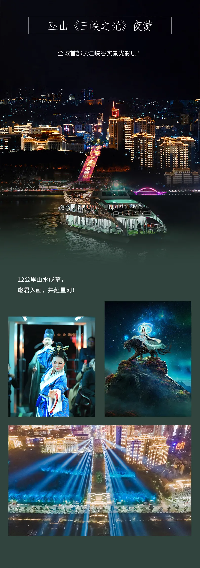 晚上,我们将在巫山乘船夜游巫山,在城市灯光之下看巫山县城灯光熠熠,并且我们安排2楼座位,在这里有着“歌舞表演”,在舞者的诗词吟诵中看两岸风景。
