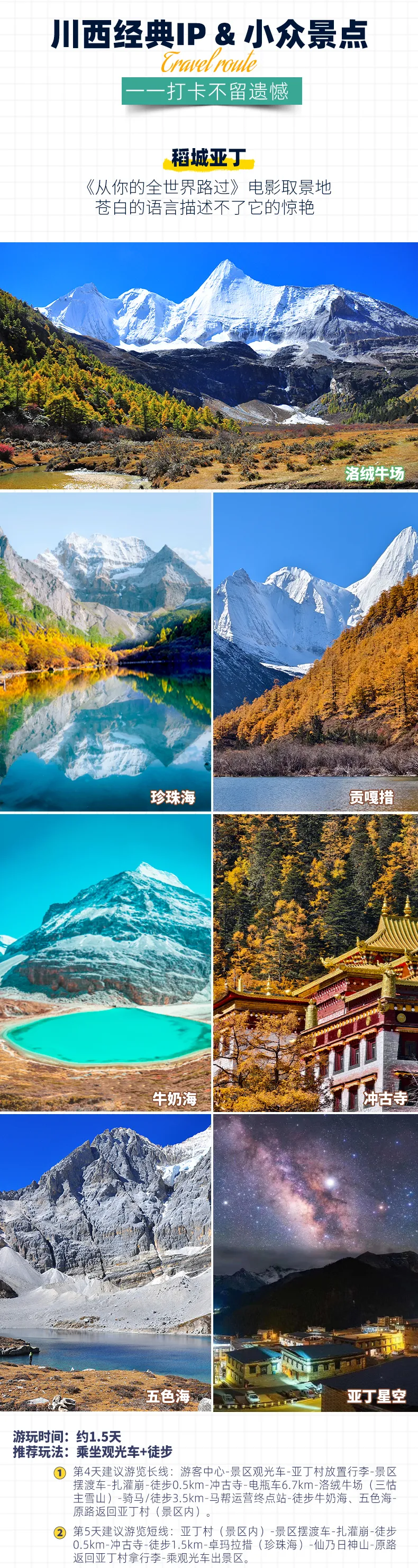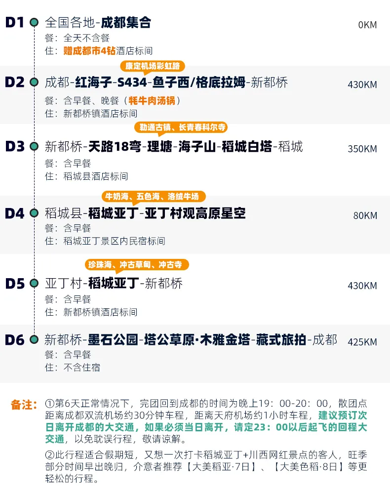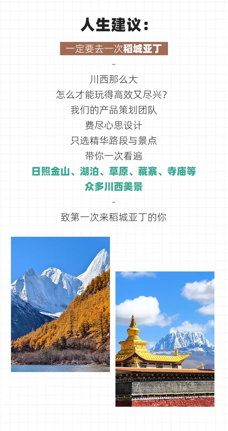 4、景交:稻城亚丁观光车120元/人(必须)、稻城亚丁游览车70元/往返(可选),墨石公园观光车20元/人(必须),红海子、鱼子西/格底拉姆等清洁费10-30元/人暂未收取,如产生需自理;