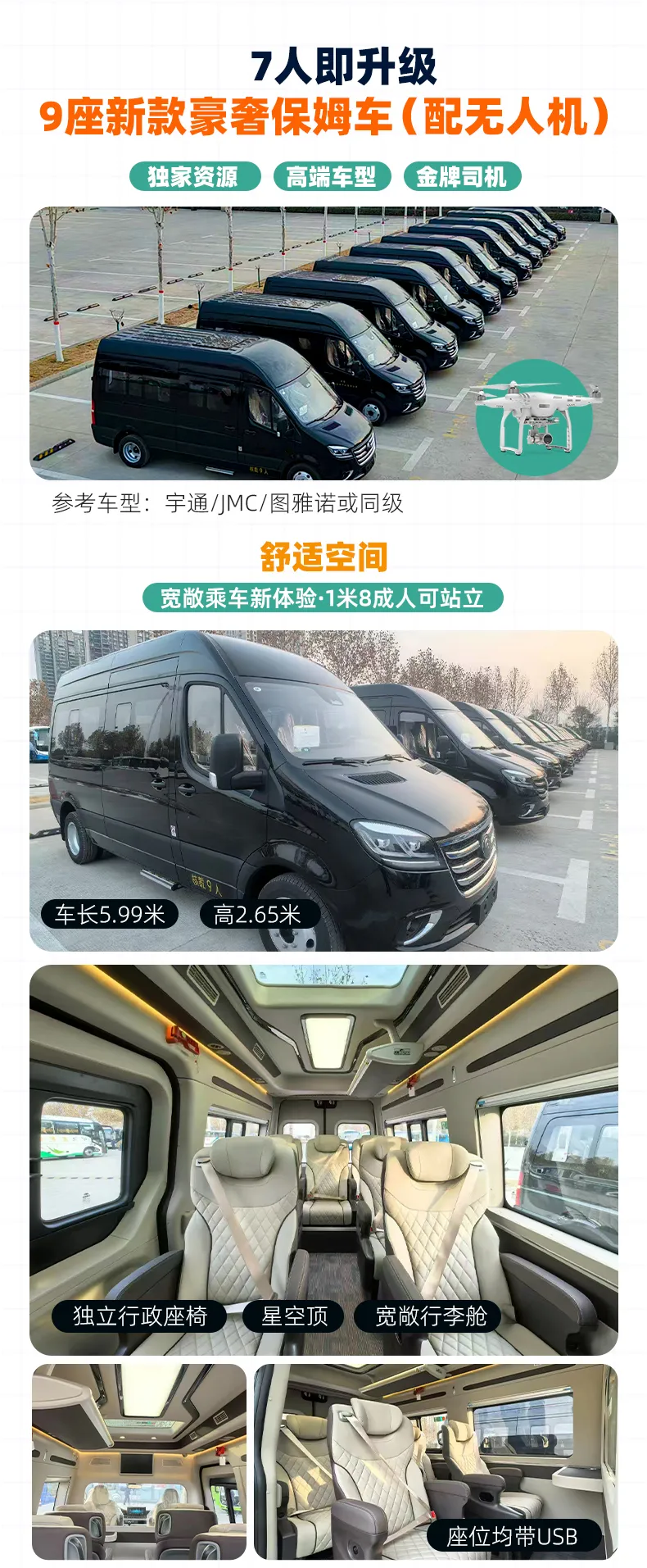 7-8位队员升级2025年新购9座豪奢保姆车(配无人机);