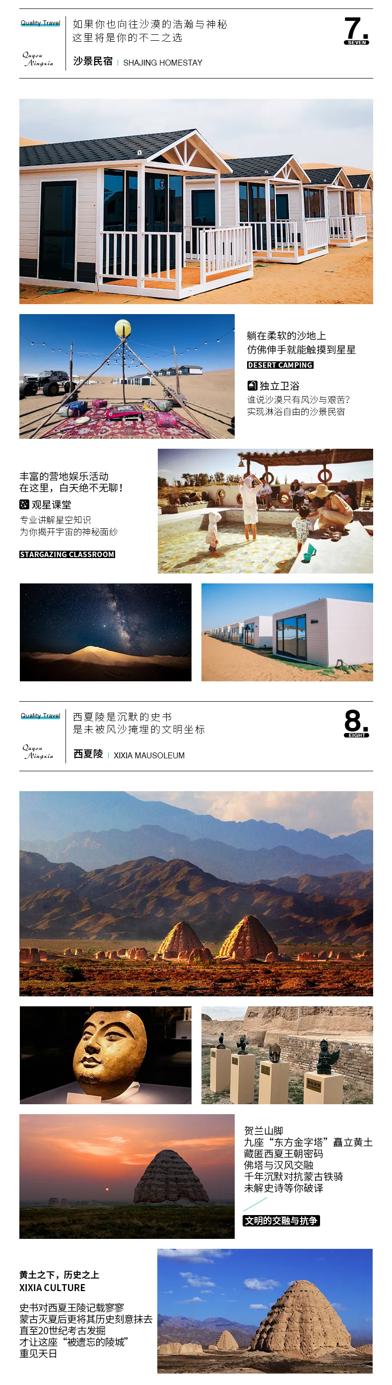 5.切莫单独行动,我们可以为您提供骆驼、向导等全部特种旅游服务。在沙漠中要注意环保,尽量把、垃圾带出沙漠,至少就地掩埋。