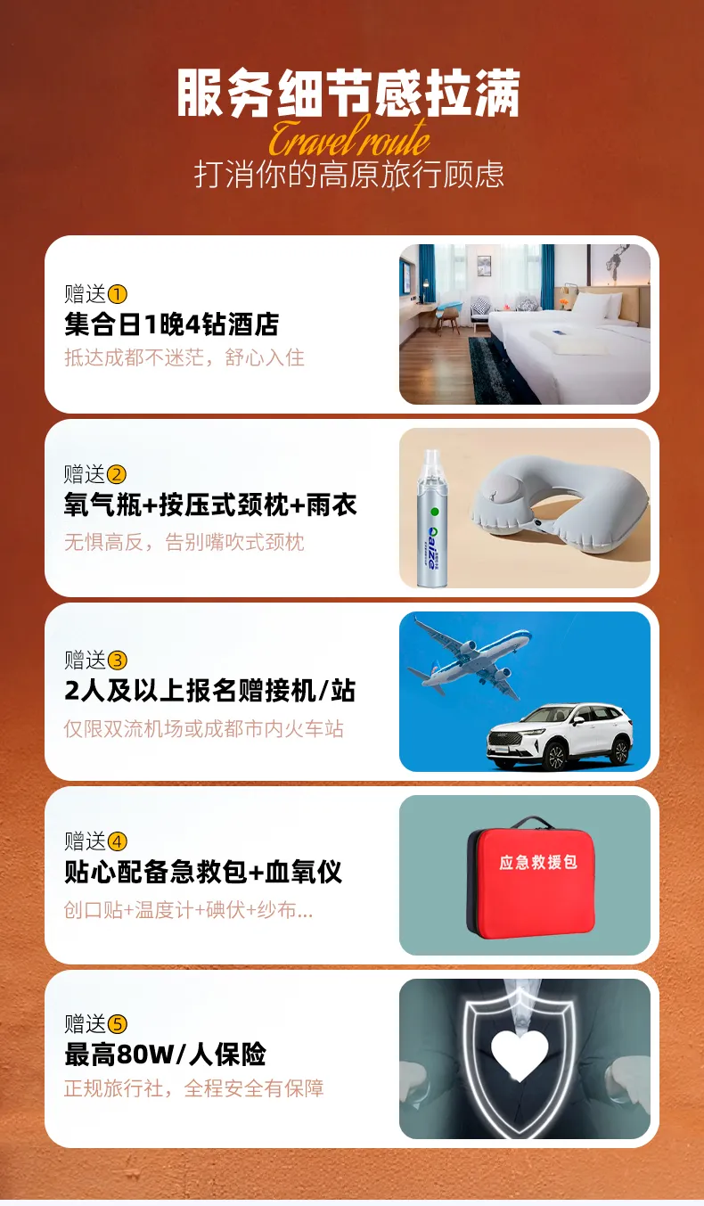 (2)领队、驾驶员、宾馆老板等工作人员均无行医资质,请不要依赖于工作人员进行救治,如果有不舒服的迹象,请告知工作人员,前往最近的医疗点进行医治。(3)特别声明:“大美色稻”因没有医疗资质,随车只提供瓶装氧气,无任何药品,请提前备足适合自己的药品。