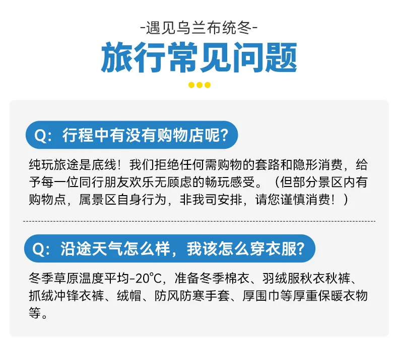 ①衣服:冬季草原温度平均-20℃,11月/12月/1月/2月准备冬季棉衣、羽绒服、秋衣秋裤、抓绒冲锋衣裤、绒帽、防风防寒手套、厚围巾等厚重保暖衣物...