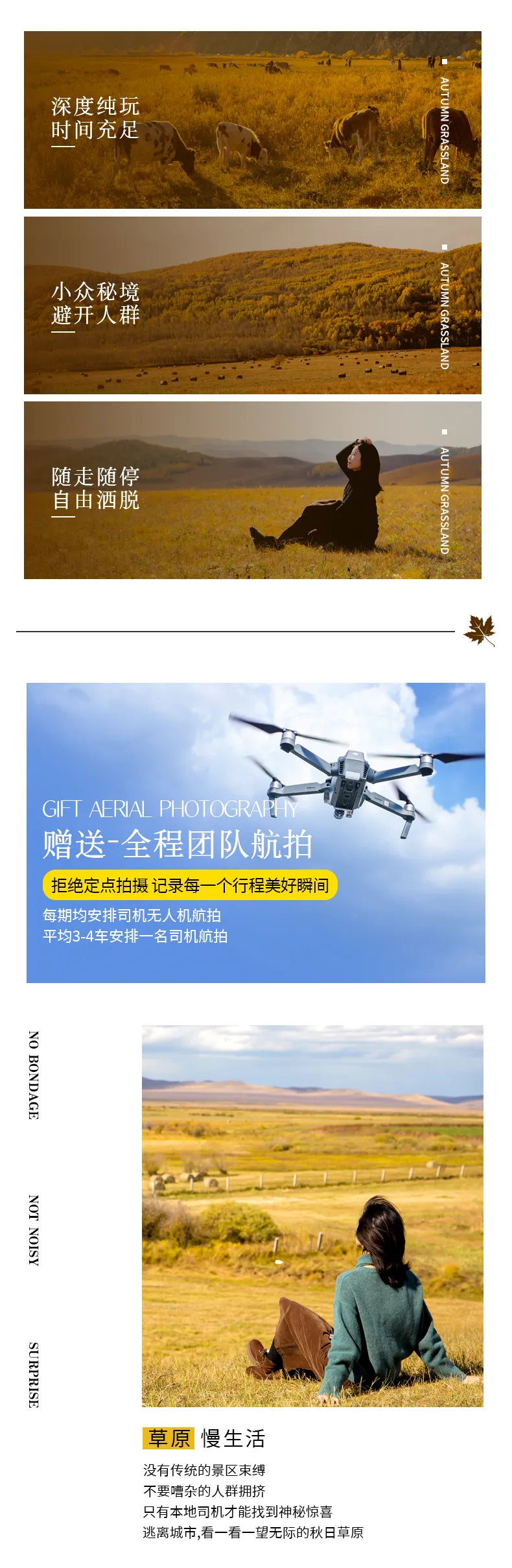 1、秋季草原早晚温差较大,出行前一定要准备好长衣长袖,厚的长衣长裤,以免着凉,另外草原傍晚蚊子多,长衣长袖不容易被蚊虫叮咬。