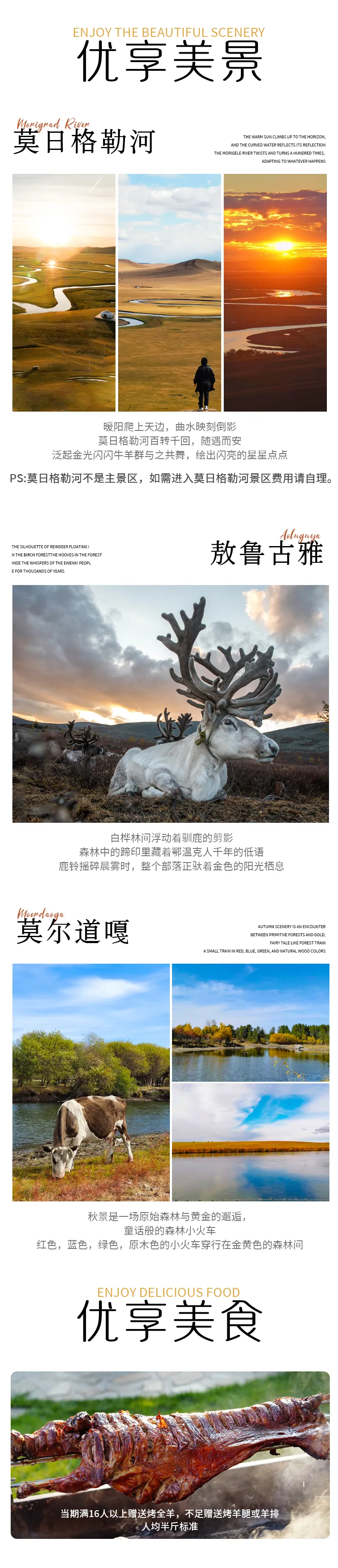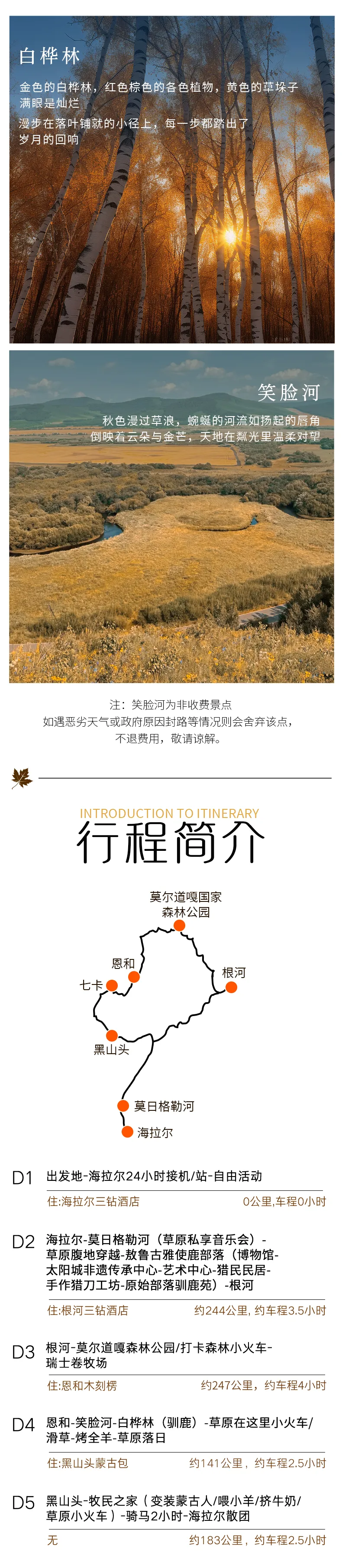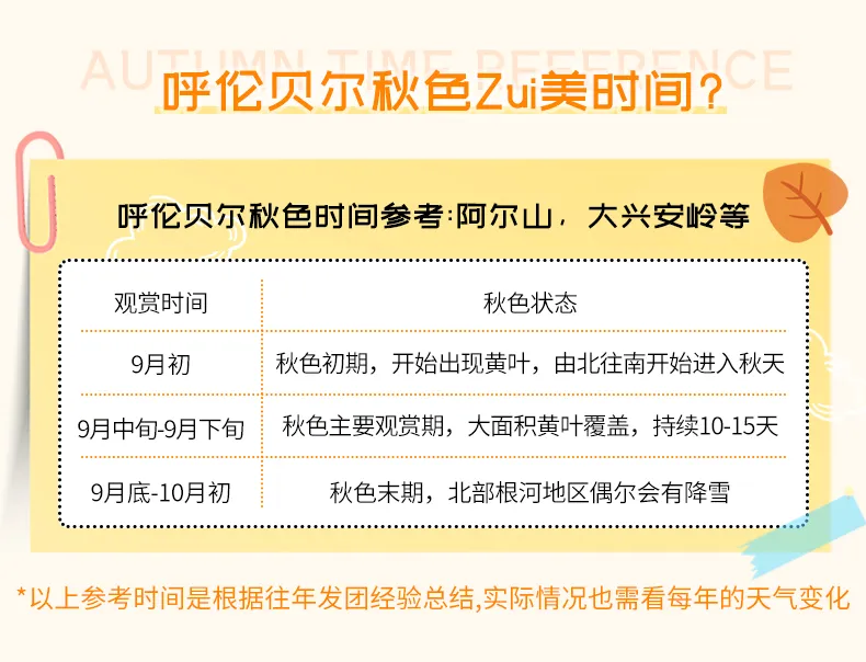 【气温参考】白天5-18℃,早晚温差大;呼伦贝尔属于地区小气候,10月份天气突变可能降雪,建议备一件厚外套在身边
