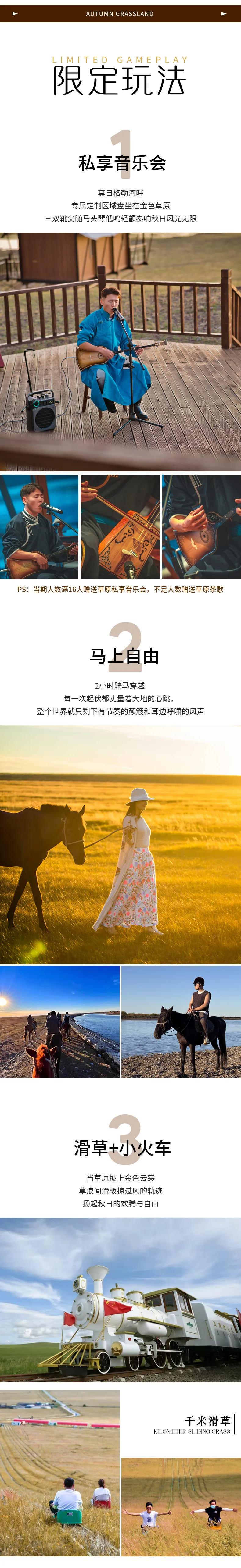 7、草原上骑马要在指定范围内活动,以免迷失方向或破坏草场。在大草原上骑马畅游,要带手套及旅游鞋。草原骑马时,一定要听从当地牧马人的安排和指挥,以免发生危险。骑马需注意安全,更不能骑马奔跑,险路和下坡路必须下马步行,否则容易受伤。尽量不要在备马区奔跑嬉戏喧哗,以免吓到马。不要在马附近开自动伞,接近马时不要做剧烈运动,以免使马受惊。不要随便给马喂食,防止被马咬伤。1.2米以下、60周岁以上不建议骑马。