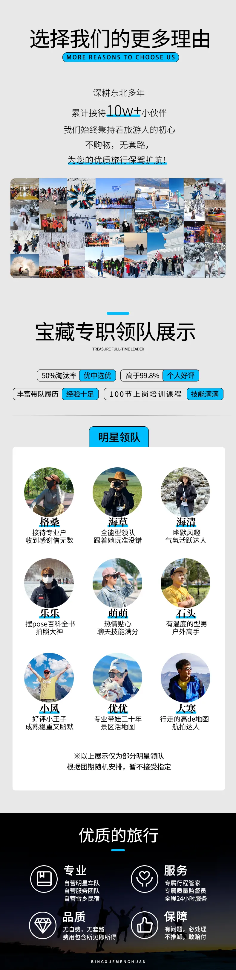 14、为了记录您在旅途中的美好瞬间,服务人员可能会为您以及同行人员拍摄一些照片,这些照片可能会被选中用于本产品活动分享、产品宣传、新媒体运营等,若您不同意授权我司使用的,请您在报名时备注。
